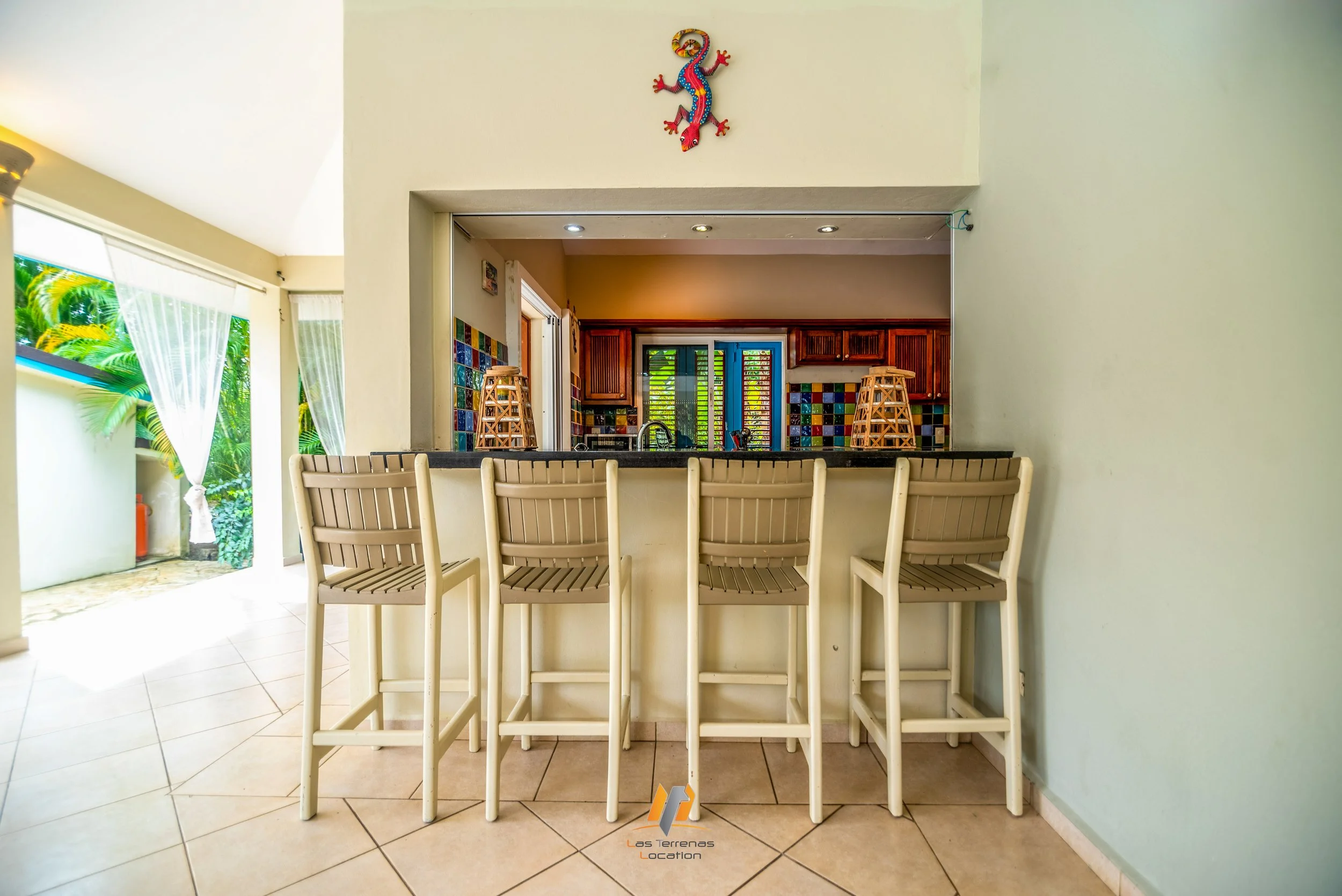 Disfruta de esta villa de 350 m², diseñada para ofrecer confort y comodidad en un entorno tranquilo y lleno de vegetación. Perfecta para hasta 6 personas, combina amplios espacios interiores y exteriores, un jardín tropical bien cuidado, piscina y una plancha para asar carnes, pescados y verduras.